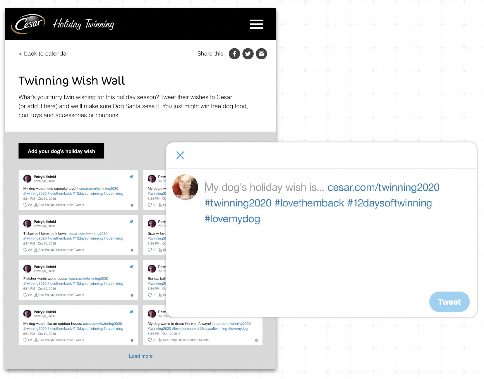 In 2020, our agency was tasked with driving consumer engagement through a comprehensive digital ecosystem experience supporting the “12 Days of Twinning” Campaign from Cesar in partnership with Weber Shandwick. The advent calendar box is the ultimate expression of twinning. But the 12 Days of Twinning is more than the calendar. More than just 12 days. It's about how every dog owner can join in twinning to boost the bond with their pet. In other words, they all win when they twin.